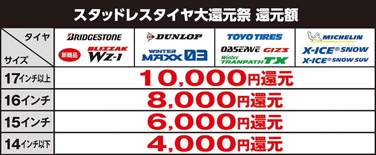 購入するスタッドレスタイヤ4本セットの税込価格から還元します。17インチ以上/16インチ/15インチ/14インチ以下の4本セット購入で還元額が異なります。